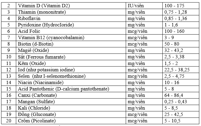 Vitamin A (như Vitamin A palmitate, 80% beta-carotene tự nhiên) 775 mcg, Vitamin C (như sodium ascorbate) 60 mg, Vitamin D (như ergocalciferol) 2,5 mcg, Vitamin E (như d-alpha tocopheryl succinate) 10 mg, Thiamin (Vitamin B1) (như thiamin mononitrate) 0,75 mg, Riboflavin (Vitamin B2) 0,85 mg, Niacin (Vitamin B3) (như niacinamide) 10 mg, Vitamin B6 (như pyridoxine HCI) 1 mg, Folate 166 mcg (100mcg Acid Folic), Vitamin B12 ( như cobalamin) 3 mcg, Biotin 50 mcg, Acid Pantothenic (Vitamin B5) (như d-calcium pantothenate) 5 mg, Canxi (như calcium carbonate) 64 mg, Sắt (như ferrous fumarate) 2,5 mg, I-ốt (như potassium iodine) 22,5 mg, Magiê (như oxit Magie) 32 mg, Kẽm (như oxit Kẽm) 1,5 mg, Selenium (như I-selenomethionine) 2,5 mcg, Đồng (như copper gluconate) 0,025 mg, Mangan (như manganese sulfate) 0,25 mg, Crôm (như chromium picolinate) 5 mcg, Sodium 10 mg, Potassium (như Potassium chloride) 5 mg, Choline Bitartrate 0,5 mg, Hỗn hợp trộn tự nhiên (Đậu nành lecithin, Bột cà rốt, Bột củ cải đỏ, Bột dâu tây, Bột táo, Bột bông cải xanh, Bột quả mơ, Citrus Bioflavonoids, Inositol, Chiết xuất quả tầm xuân) 10 mg. Các thành phần khác: Sucrose, Fructose, Mannitol, Cellulose vi tinh thể, Hương vị tự nhiên, Chiết xuất vỏ nho (màu), Xylitol, Carrageenan, Acid Citric, Acid Malic, Cellulose thực vật, Xanthan Gum, Magnesium Stearate thực vật, Acid Stearic thực vật. Có chứa đậu nành.
